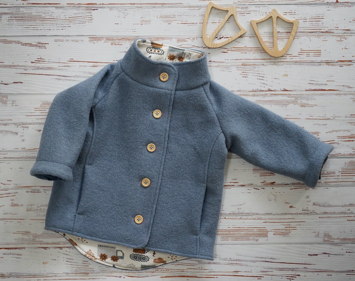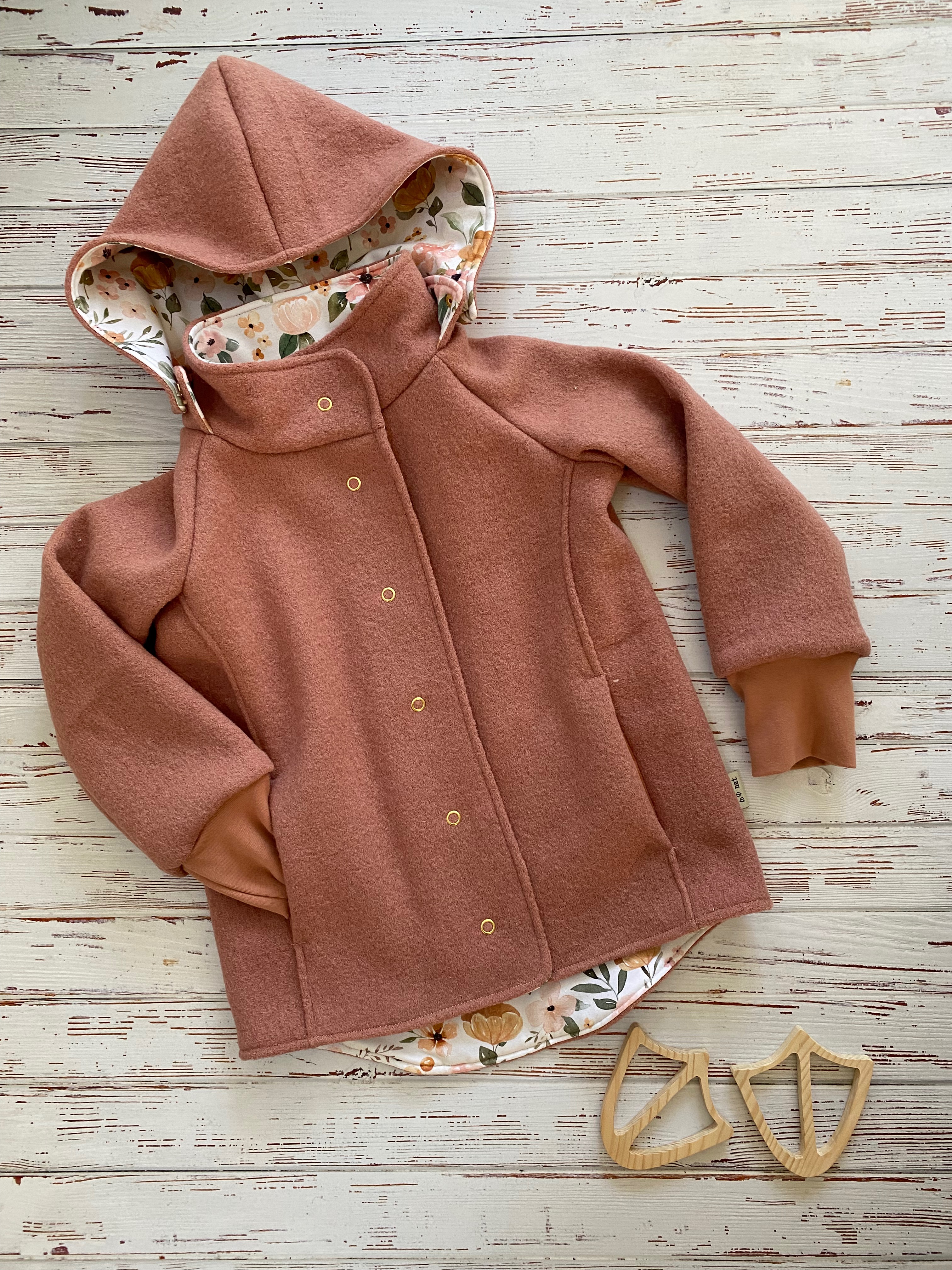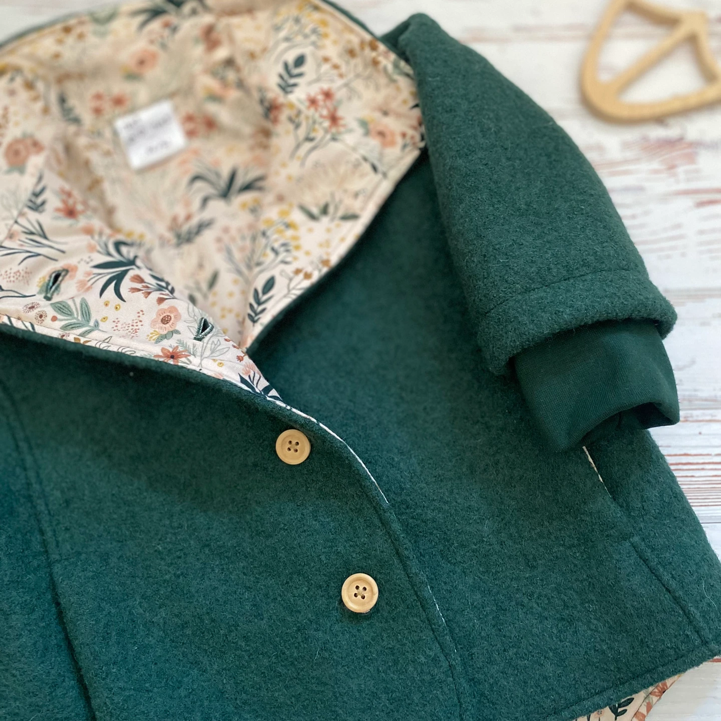 Der Schnitt ist wunderbar mitwachsend konzipiert. Die Jacke kann gut auf Zuwachs gekauft werden. So sitzt sie zunächst wie ein Mantel und später wie eine Jacke. Durch die Rundung an der Rückseite, ist der Po aber stets verdeckt.