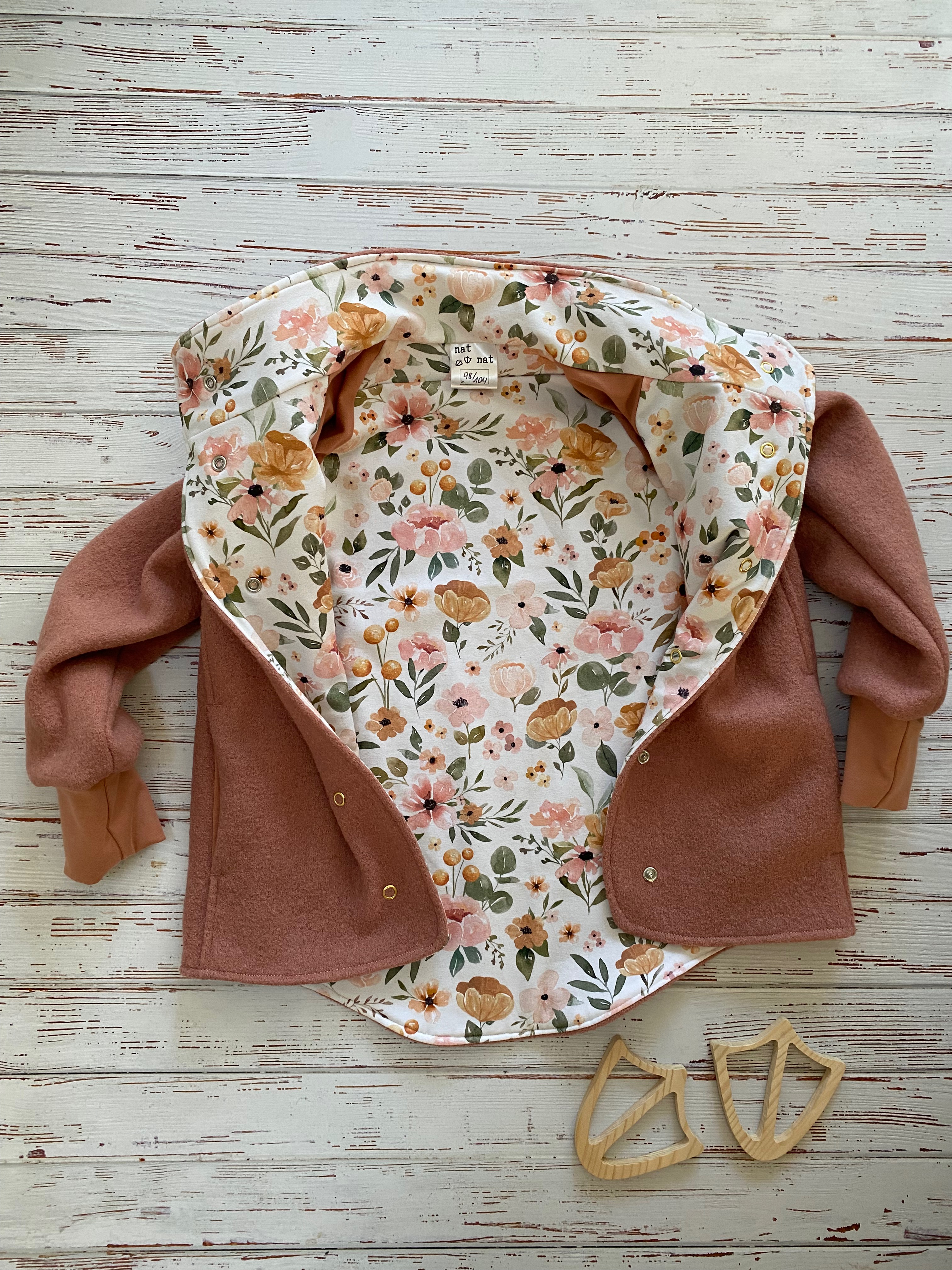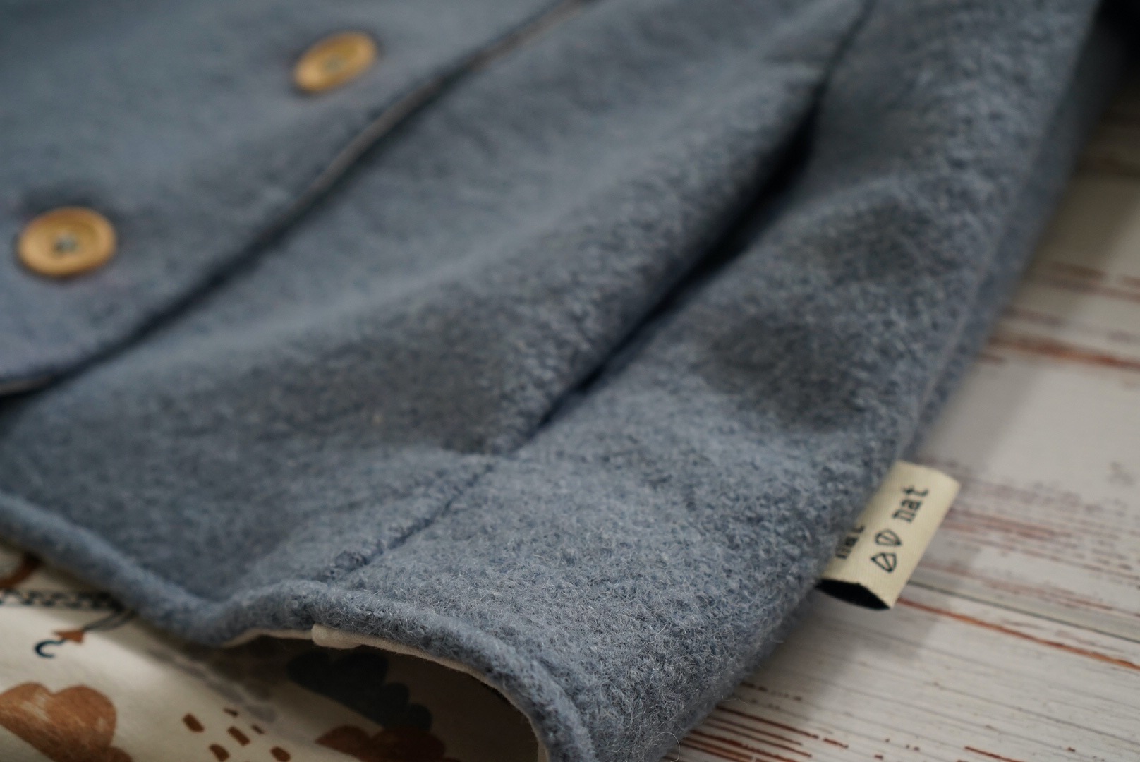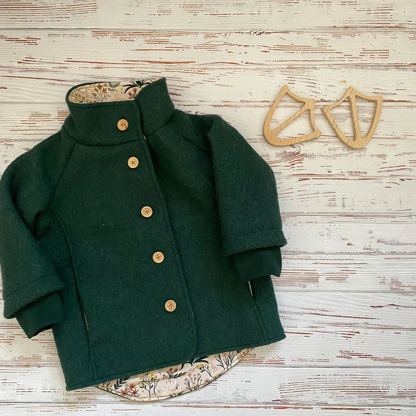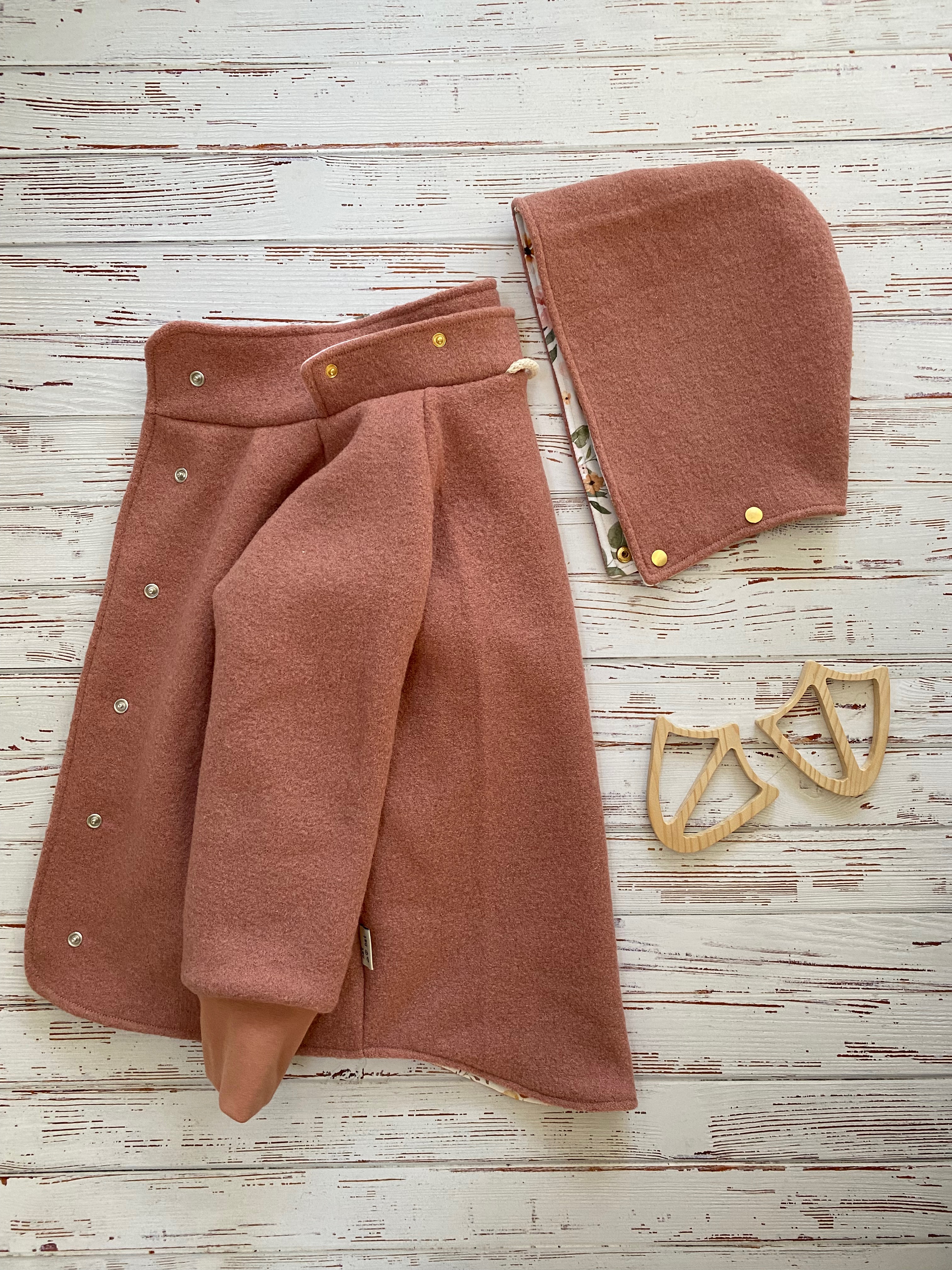 Der Schnitt ist wunderbar mitwachsend konzipiert. Die Jacke kann gut auf Zuwachs gekauft werden. So sitzt sie zunächst wie ein Mantel und später wie eine Jacke. Durch die Rundung an der Rückseite, ist der Po aber stets verdeckt.